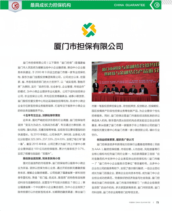 近日,《中国担保》十周年特刊公布了全国优秀担保机构及担保人评选结果。面对上千家担保机构的激烈竞争,厦门市担保有限公司凭借身后专业实力和良好经营成效,荣获全国“最具成长力担保机构”称号,李云祥总经理荣获全国“最具影响力担保人”称号,是全省唯一一家同时荣获上述两项殊荣的担保机构。《中国担保》由“全国中小企业信用担保机构负责人联席会”主办,是承接政府、金融、投资、担保的桥梁,由国家工业和信息化部中小企业司指导的中国中小企业信用担保业唯一综合性权威期刊,创刊十周年间深受担保业界的广泛认可。