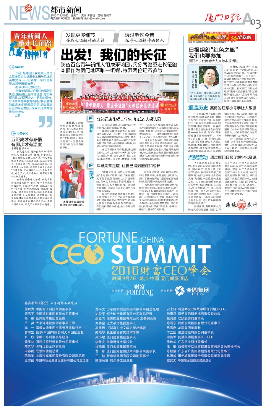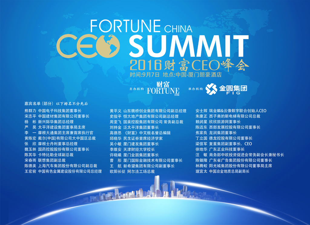 2015年财富ceo峰会:2015年10月21-22日,由美国《财富》(中文版)主办,金圆集团承办的“财富ceo峰会”在厦门国际会议中心隆重举行,这是该峰会首次在北京之外的城市举办。本次峰会邀请了《财富》500强企业代表、境内外优秀企业精英、知名专家学者共300人云集厦门,共同探讨“企业发展新模式与新平台”,彰显厦门城市品牌,打造国际一流营商环境。峰会以“一带一路”产业布局与投资、企业发展的新动力和新模式、国企转型升级的改革之路、自贸试验区助更多企业进入世界大家庭、两岸三地共建厦门金融中心、新三板成为投资洼地及万物互联是未来的趋势等为分议题,共同探讨了未来经济走向和发展新机遇。同时,峰会为15家中国上市公司颁发了“最佳投资回报公司”、“最佳风险管控公司”和“最佳战略创新公司”奖项。峰会期间,金圆集团组织嘉宾考察厦门经济社会发展情况,参观厦门两岸金融中心和厦门自贸区,并与政府部门和企业界进行深入交流。