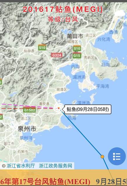 据厦门市气象台报告: 今年第17号台风“鲇鱼”(台风级)于9月28日凌晨4:40在福建省泉州市惠安县沿海登陆,登陆时中心最大风力12级(33米/秒),中心最低气压975百帕。