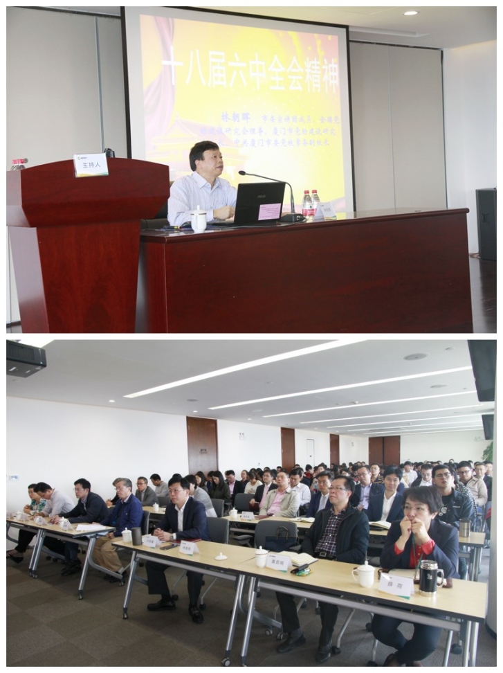 2016年10月24日至27日,中国共产党第十八届六中全会在北京隆重举行。为深刻理解全会精神,营造全面从严治党的良好政治生态,促进集团各项业务的不断发展,12月9日下午,金圆集团在48层会议室举办了学习贯彻党的十八届六中全会精神培训会,特邀中共厦门市委党校常务副校长、厦门市党建研究会会长、市委十八届六中全会精神宣讲团成员林朝晖作专题培训。集团公司党委书记、董事长许晓曦主持报告会。集团全体党员、集团中层及以上干部等200余人参加了报告会。