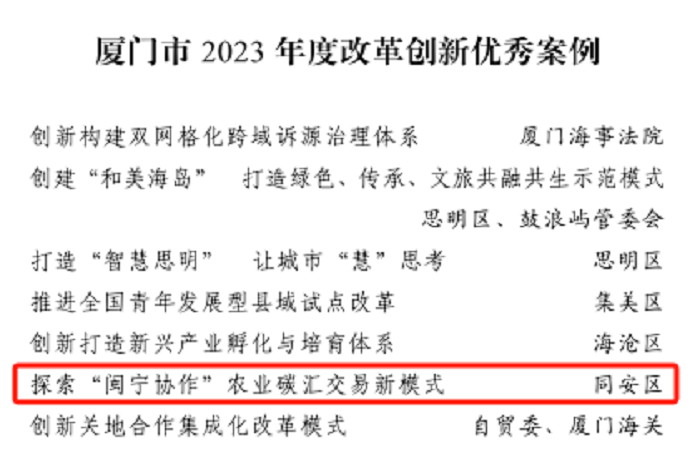 金圆集团旗下厦门产权交易中心协同厦门市同安区农业农村局共同推进的“探索‘闽宁协作’农业碳汇交易新模式”案例获评厦门市2023年改革创新优秀案例。