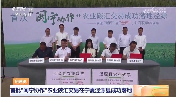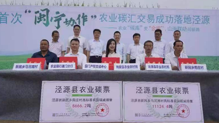2023年8月10日,在厦门市同安区、金圆集团与厦门农业银行的共同发动下,热心支持“闽宁协作”的企业及个人通过厦门产权交易中心农业碳汇交易平台,购买泾源县新民乡南庄村和马河滩村部分高标准农田碳减排量19790.6吨,将“同安特色”的农业碳汇交易经验复制到千里之外的泾源县,进一步助力泾源县广大农民群众增收致富,打造闽宁协作新样板。