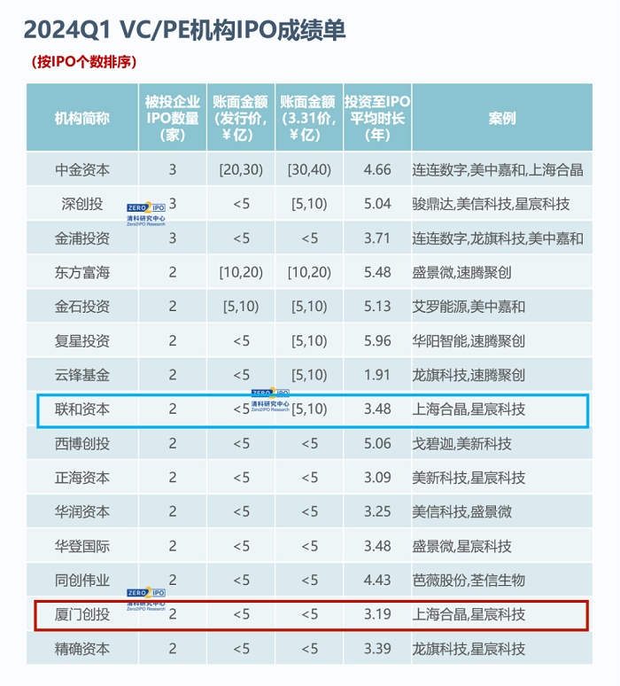 近期,清科发布《ipovc/pe机构ipo成绩单:近5年新低》报告,金圆集团成员企业厦门创投成为2024年一季度收获2个及以上ipo的15家vc/pe机构之一,投资至ipo平均时长仅为3.19年,在上榜机构中ipo效率排名前三。厦门创投管理的厦门市产业投资基金参股基金联和资本等同样位列榜单。