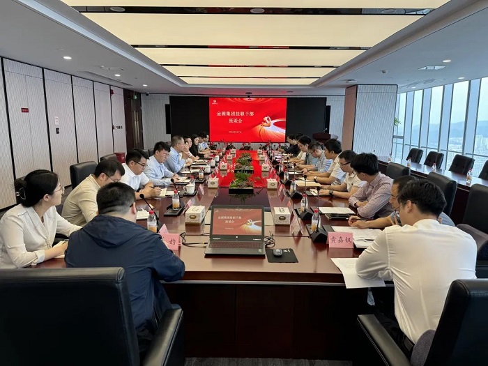 为加强集团外派挂职干部管理,关心关怀挂职干部在外工作生活情况,6月7日上午,金圆集团召开挂职干部座谈会,集团党委副书记黄四海及相关职能部门负责人,与集团18名外派挂职干部谈心谈话,了解挂职干部思想、工作和生活情况,勉励外派挂职干部加强学习、提高综合素质、发挥优势作用、展现金圆形象。