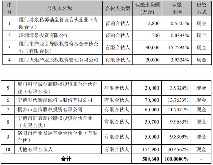 宁德时代此次参投的碳中和基金是典型的“cvc 地方国资资金”模式,由宁德时代旗下厦门溥泉私募、深圳溥泉投资发起设立,厦门市产业投资基金、厦门火炬产业投资基金、厦门科学城创新股权投资基金、福建省金投金鹏创业投资基金等共同出资,拟募集50.86亿元,主要投向新能源和高端制造等产业领域。通过省、市、区级投资基金多级联动,合力出资支持重大产业项目,形成产业培育合力。