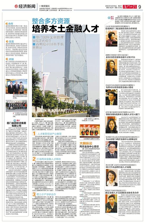 随着厦门国际金融管理学院昨日正式启动,金圆集团携手两岸三地一批高水平高等院校、教育培训机构及行业协会,培养和引进一批具备国际化视野、全球化资本运营意识、能够熟练驾驭金融管理工具的高端金融专才,在国际化与本土化之间、金融市场与金融产品之间形成高效对接,形成厦门自身的核心金融人才队伍,为厦门乃至海峡西岸经济区金融业的长远发展提供强有力的人才支撑和智力支持,更好地引领两岸金融中心的成长,成为两岸金融中心建设的“加速器”和经济发展的“新引擎”。