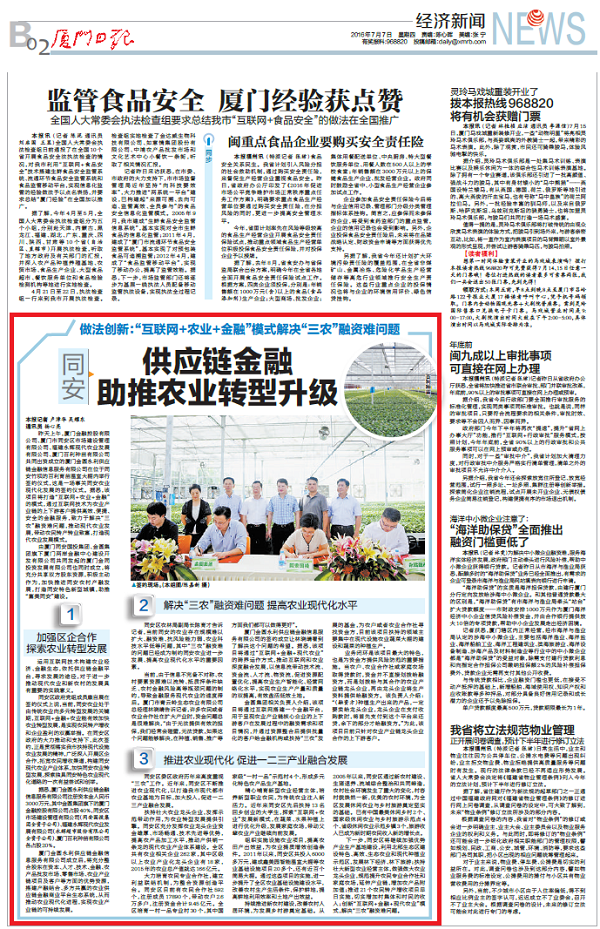 厦门金圆永利供应链金融信息服务有限公司的签约成立让林晓晴看到了解决这个问题的希望。据悉,该项目将通过“互联网 金融 现代农业”的跨界运作方式,推动互联网和农业深度融合发展,以信息流带动技术流、资金流、人才流、物资流,促进资源配置优化,提高农业生产智能化、经营网络化水平,实现农业生产产量和质量的双提高,有效盘活低效土地。