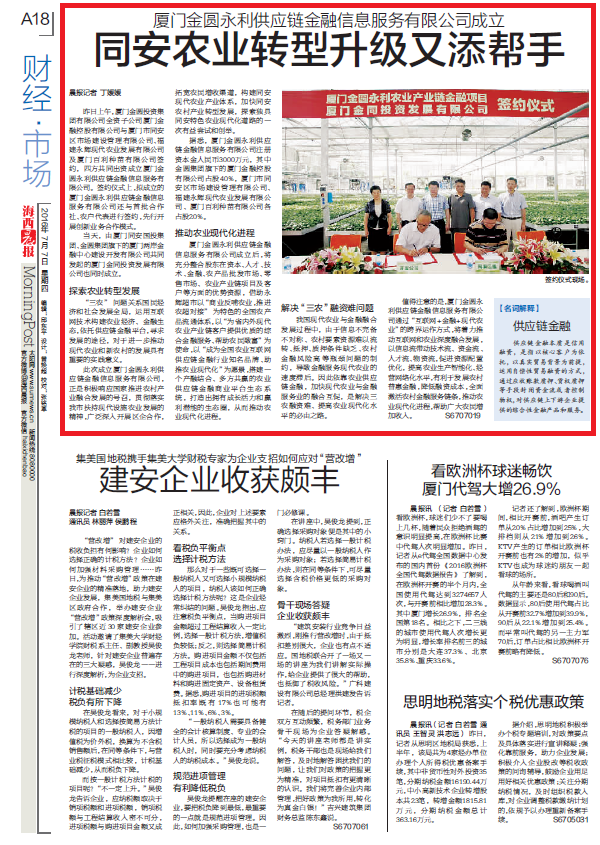 7月6日上午,厦门金圆投资集团有限公司全资子公司厦门金融控股有限公司与厦门市同安区市场建设管理有限公司、福建永辉现代农业发展有限公司及厦门百利种苗有限公司签约,四方共同出资成立厦门金圆永利供应链金融信息服务有限公司。签约仪式上,拟成立的厦门金圆永利供应链金融信息服务有限公司还与首批合作社、农户代表进行签约,先行开展创新业务合作模式。