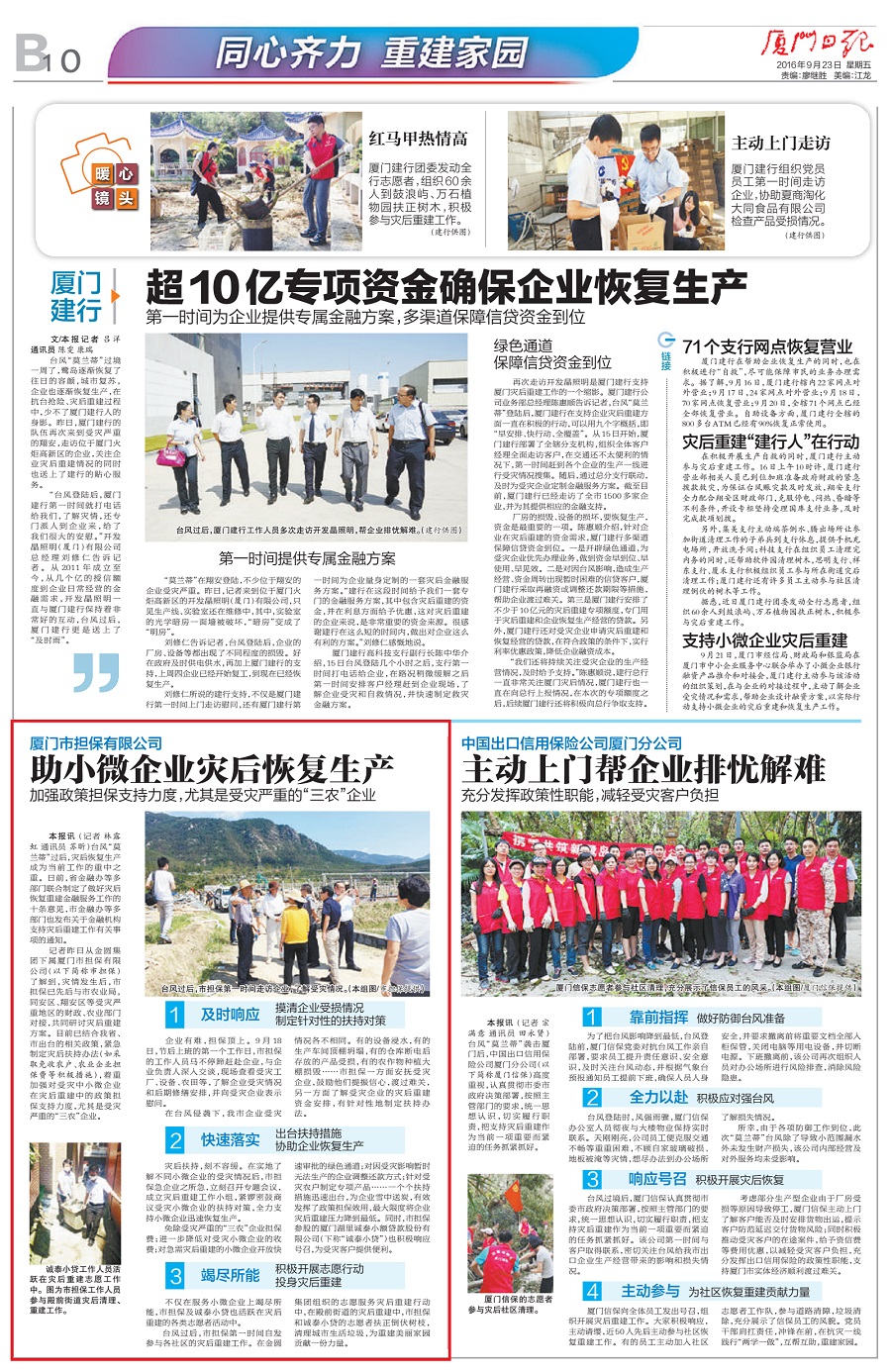 厦门日报讯 (记者 林露虹 通讯员 苏昕)台风“莫兰蒂”过后,灾后恢复生产成为当前工作的重中之重。日前,省金融办等多部门联合制定了做好灾后恢复重建金融服务工作的十条意见,市金融办等多部门也发布关于金融机构支持灾后重建工作有关事项的通知。