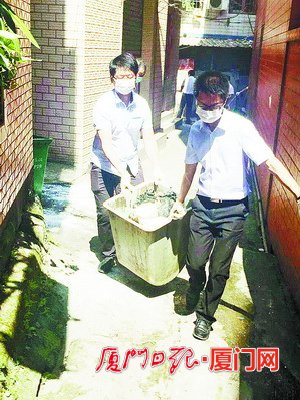 诚泰小贷工作人员活跃在灾后重建志愿工作中。图为市担保工作人员参与殿前街道灾后清理、重建工作。
