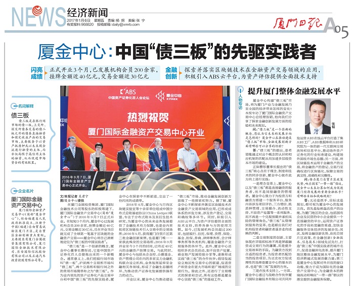 在厦门金圆投资集团、厦门国际金融技术公司等股东的积极筹建下,厦门国际金融资产交易中心(简称“厦金中心”)于2016年9月7日正式开业。在短短3个月内,厦金中心已发展机构会员200余家,挂牌金额近40亿元,交易金额近30亿元,且在开业当日就完成了全球第一笔基于区块链的金融资产交易——厦金中心将自己清晰地定位为“债三板的中国实践者”。