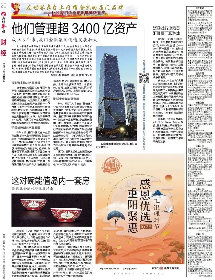 今年6月,厦门华强文化产业项目三期方特水上乐园开园迎客;去年年底,中国大陆首条第6代ltps产线——厦门天马微电子g6 ltps产线实现全面量产,吸引华为、小米、联想、华硕等成为首批客户。近年来,金圆集团不断加强对厦门市重点支持产业、招商引资项目的投资和管理力度,先后投资了天马微电子、联芯集成电路制造、厦门华强、三安等一系列厦门重点产业项目,以金融服务实体经济,带动区域经济发展。截至目前,上述产业投资项目累计总投资660亿元,全面实现投产后,预计年产值近300亿元,上缴税金逾12亿元,增加就业逾2.3万人。