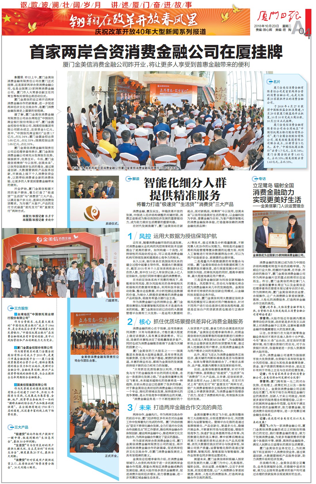 厦门金美信消费金融有限责任公司作为两岸金融片区的重点招商项目,在市委、市政府的正确领导和大力支持下,借助我国放宽金融市场准入的政策东风,于10月22日在厦门正式挂牌,这是首家两岸合资消费金融公司,也是全国第23家开业的持牌消费金融公司。