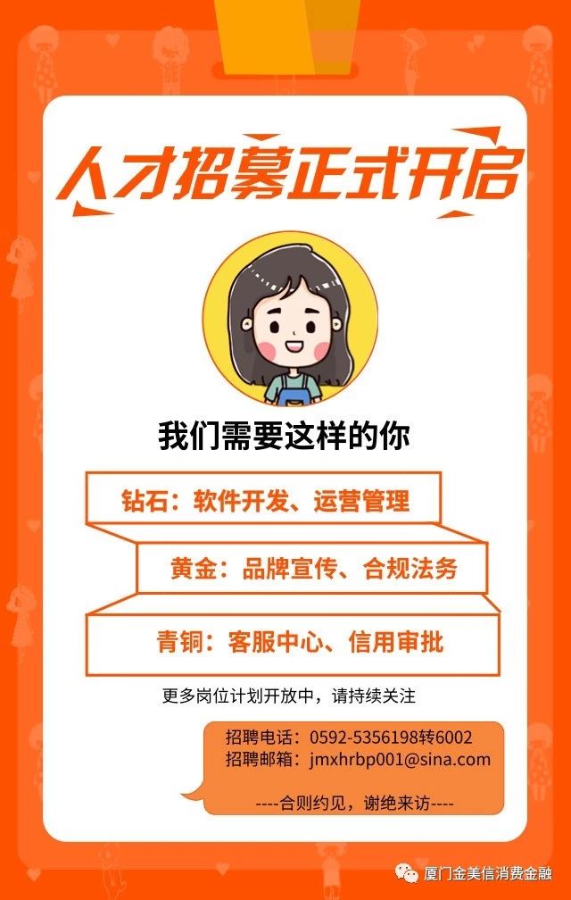 在时代发展浪潮下,厦门金美信站在新起点,面对新挑战,将秉持“今以信用,创美未来”以信用创造美好生活的理念,以金融科技为手段,普惠金融为目标,为客户智能化的消费金融服务体验,打造值得信赖的消费金融优质品牌!
