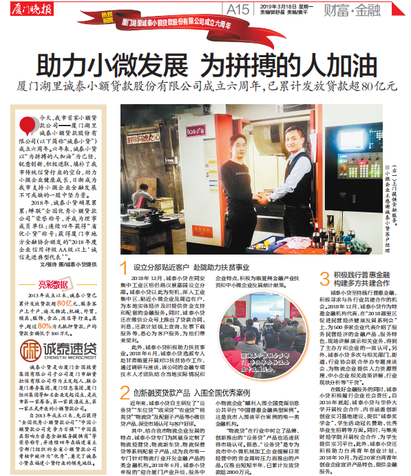 其中,结合我市物流企业发展的特点,诚泰小贷专门为其量身定制了物流经营贷、物流新车贷、物流保费贷等系列配套子产品,成为我市唯一专门针对物流行业开发金融产品的类金融机构。2018年6月,诚泰小贷申报的“迎合厦门产业升级,服务中小物流企业”顺利入围全国党媒信息公共平台“中国普惠金融典型案例”。这是我市入围该平台案例的唯一类金融机构。