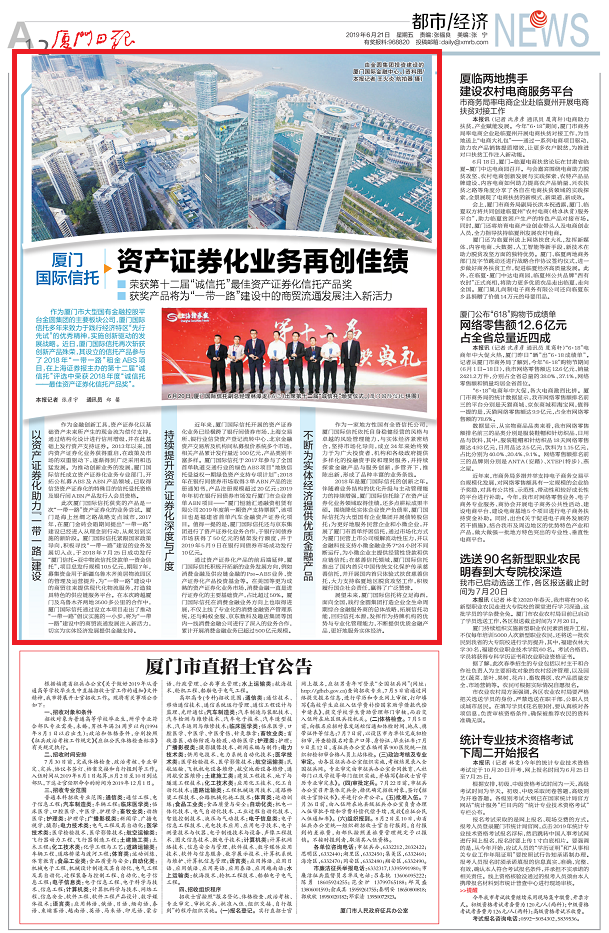 作为厦门市大型国有金融控股平台金圆集团的主要板块公司,厦门国际信托多年来致力于践行经济特区“先行先试”的优秀精神,实施创新驱动的发展战略。近日,厦门国际信托再次斩获创新产品殊荣,其设立的信托产品参与了2018年“一带一路”租金abs项目,在上海证券报主办的第十二届“诚信托”评选中荣获2018年度“诚信托——最佳资产证券化信托产品奖”。