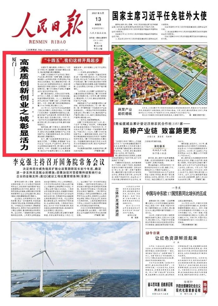 5月13日,人民日报头版头条刊发通讯《厦门——高素质创新创业之城彰显活力》点赞福建省厦门市矢志不渝坚持创新驱动推动高质量发展,从经济特区“开荒地”成为创新发展“试验田”。