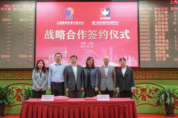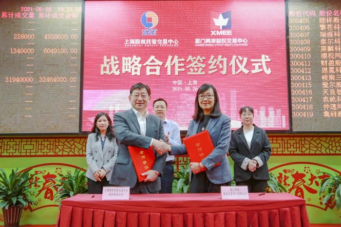 活动现场,在厦门、上海两地地方金融监管局和台办领导的见证下,厦门两岸股交中心总经理李霁与上海股交中心党委书记、总经理张云峰分别代表双方签订了战略合作协议,根据合作协议的约定,双方除了推动台资企业在沪厦两地挂牌展示外,还将在业务规则共建、信息互通、资源共享、创新研究、监管协作、课题研究等方面开展深入合作。