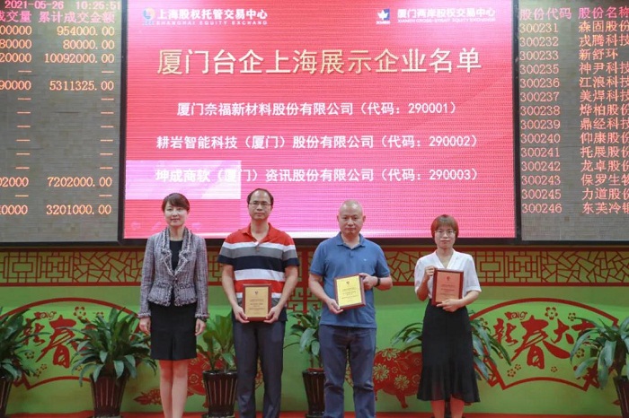 本次首批3家来自厦门两岸股权交易中心的挂牌台资企业在上海股权托管交易中心展示,同时,5家在上海股权托管交易中心托管记录的台资企业,在厦门两岸股权交易中心“台资板”展示,实现了“一地挂牌、两地展示”。厦门、上海两地地方金融监督管理局、台办相关领导及各界嘉宾出席本次活动。