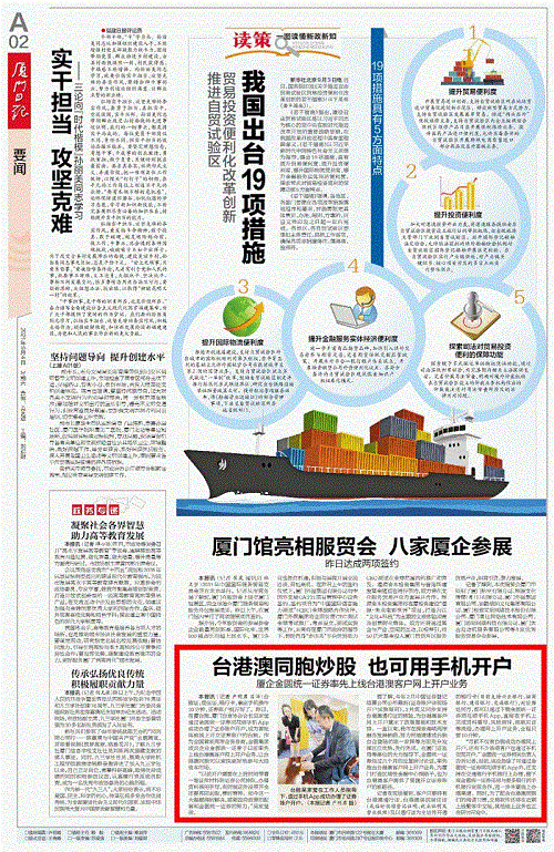 9月2日,金圆统一证券在全国范围内率先上线台港澳客户网上开户业务,相较于过去一般要花近1小时在柜台办理,现在台港澳客户通过网络只需约10分钟,就能足不出户办理开户。