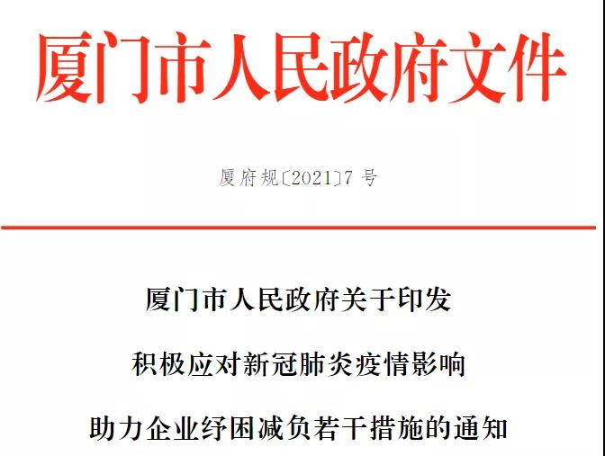 近日,厦门市人民政府网站发布了《厦门市人民政府关于印发积极应对新冠肺炎疫情影响助力企业纾困减负若干措施的通知》。