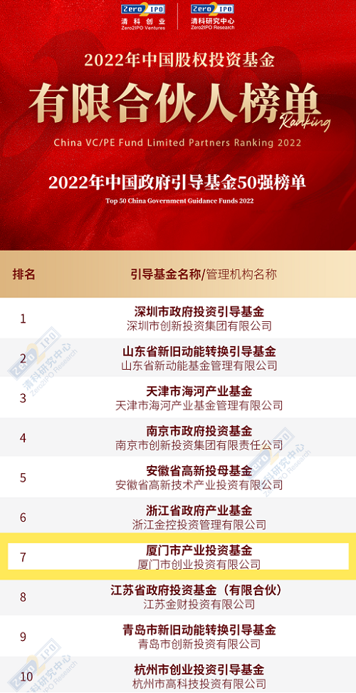 近日,金圆集团旗下厦门创投及其受托管理的厦门市产业投资基金七年蝉联清科中国股权投资基金有限合伙人榜单,获评“2022年中国政府引导基金第七名”。