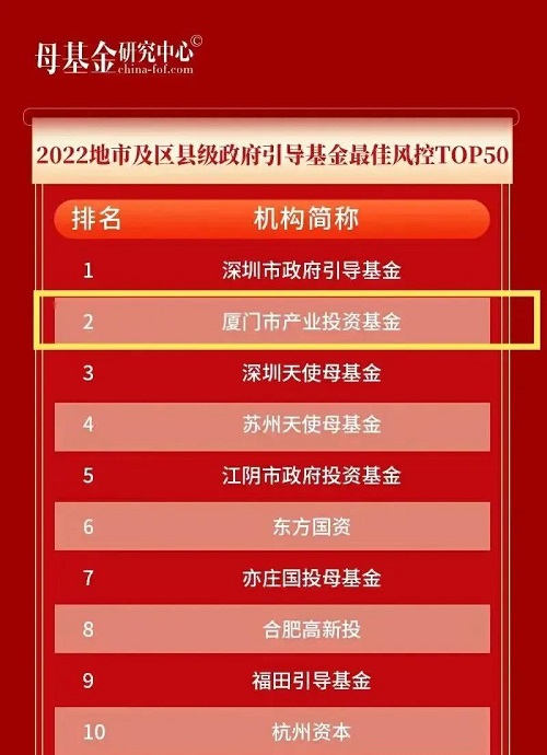 不久前,2022年母基金研究中心年中榜单发布,厦门市产业投资基金荣获“2022地市及区县级政府引导基金最佳风控第二名”、“最受投资机构欢迎的地级政府lp第十名”。本次获奖代表着股权投资市场对厦门优质金融扶持政策及金融生态环境的关注和肯定。