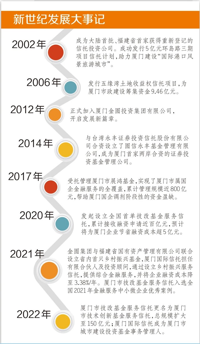 首次境外筹措中长期贷款服务厦门华侨电子有限公司债务重组、落地厦门市首笔外汇银团贷款帮助厦顺铝箔引进设备、实现国内最大一笔对外担保项目支持翔鹭纺纤发展……在推动中外合资重大产业项目落地的同时,厦门国际信托还最先参与了厦门早期企业的股份制改造和债券发行工作,为厦门上百家重点企业提供融资支持。