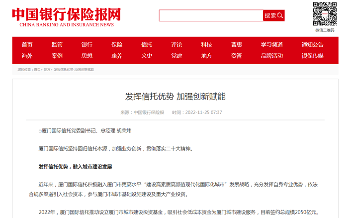 厦门国际信托坚持回归信托本源,加强业务创新,贯彻落实二十大精神。