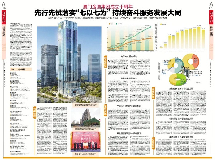 站在十周年的新起点上接续奋斗,金圆集团正积极落实市委“七以七为”部署要求,有力发挥资本招商和产业合作的重要载体功能,聚焦金融核心主业,助推产业转型升级,加快展业布局和数字化转型,精耕厦门,融合两岸,服务全国,全力打造全国一流的综合金融服务商。