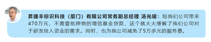 我市通过设立增信基金、技术创新基金、持续开展应急还贷服务等方式,优化民营企业融资服务。昇捷丰标识科技(厦门)有限公司是一家从事喷码设备生产及系统集成设计的高新技术企业。今年公司计划加大研发投入,但作为一家轻资产运营的科技型企业,想要获得银行传统授信支持并不容易。了解到企业需求后,在金圆集团的指导下,厦门市担保携手厦门银行向公司推荐了增信基金贷款。