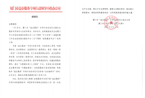 来自厦门市“益企服务”专项行动领导小组办公室的感谢信