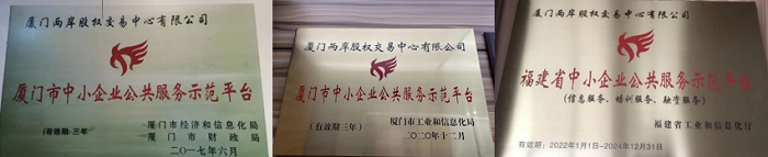 厦门两岸股权交易中心自成立以来,为中小微企业提供培育孵化、改制辅导、展示挂牌、登记托管、融资转让、财务顾问、管理培训、路演宣传、上市培育等一揽子服务,先后获得“海西标杆”金融机构、深交所“闽南科技金融路演中心”、厦门市中小企业公共服务示范平台、福建省中小企业公共服务示范平台、2016-2019年厦门市中小企业服务月活动优秀组织奖、厦门“双百”人才企业金融服务驿站、厦门市人才培训基地、厦门市人才工作先进集体、厦门市直系统文明单位、火炬创新券服务机构、深圳证券交易所厦门基地、厦门市企业上市培育中心等荣誉、资质。