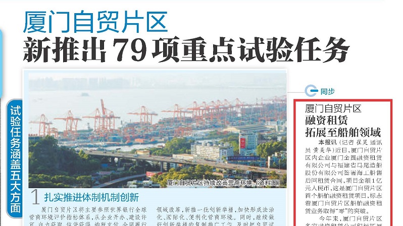近日,厦门自贸片区内企业厦门金圆融资租赁有限公司与福建省马尾造船股份有限公司签署...