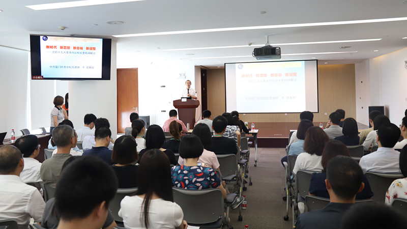 为深入学习宣传贯彻党的十九大精神,深化学习效果,帮助非党员干部职工学懂弄通习近平新时代中国社会主义思想和党的十九大精神的思想精髓和核心要义,7月13日,金圆集团党委在厦门国际金融中心48层会议室举办学习党的十九大精神非党员专题讲座,特邀厦门市委党校牛君教授解读党的十九大基本内容和主要精神,160余名入党积极分子、非党员干部职工参加培训。