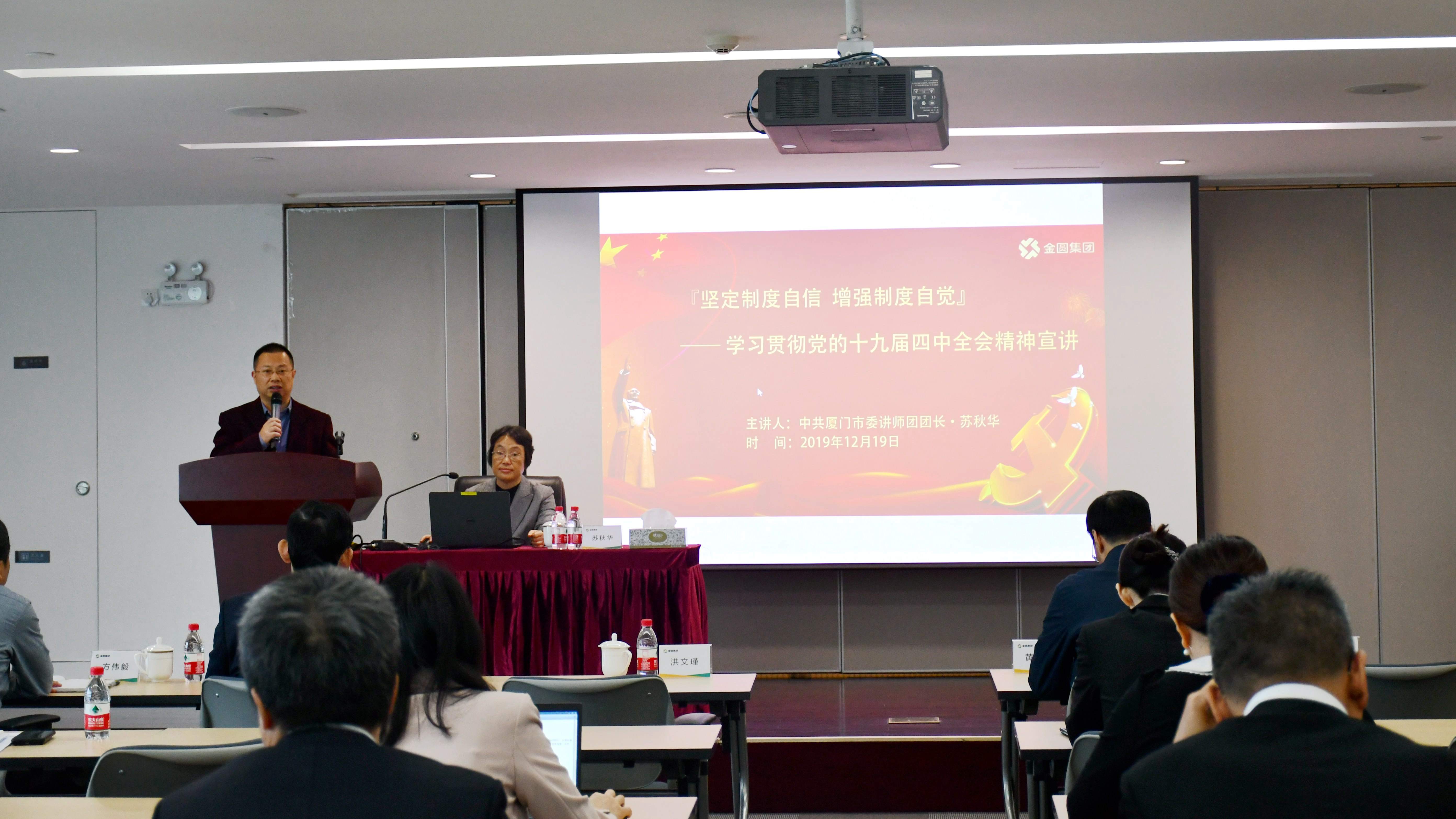 为深入学习贯彻党的十九届四中全会精神,切实把党员干部思想和行动统一到全会精神上来,扎实推进治理体系和治理能力现代化,更好地保障和推动集团高质量发展,助力厦门“两高两化“城市建设。12月19日上午,金圆集团党委组织中心组(扩大)学习暨学习贯彻党的十九届四中全会精神宣讲报告会,邀请市委讲师团团长苏秋华教授作宣讲报告。集团党委领导班子成员,总经理助理,集团全体中层干部及青年智库、党务干部百余人参加。